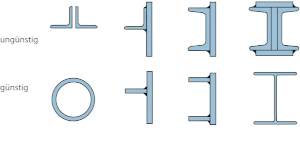 Oberflächenformen, auf denen sich Wasser ansammelt, sind zu vermeiden. In Kombination mit Fremdstoffen wächst die Korrosionsgefahr. Um durch Anlagerungen keine Angriffsfläche zu bieten, sind Taschen und Vertiefungen zu umgehen. Nach oben hin offene Profile sollte es nach Möglichkeit nicht geben. Als günstig erweisen sich geneigte und abgeschrägte Oberflächen.