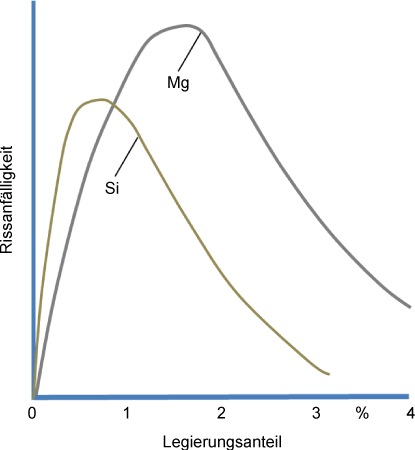 Für Aluminium gilt, dass die Mehrzahl der Knetlegierungen geeignet sind, um mit dem Laserstrahl gefügt zu werden. In Abhängigkeit der Legierungselemente können jedoch Heißrisse entstehen, die eine ungenügende Schweißnahtqualität mit sich bringen. Insbesondere Kupfer wirkt sich negativ auf die Heißrisssicherheit der Schweißnaht aus. Auch die Legierungselemente Silizium und Magnesium sind in bestimmten Konzentrationen ungünstig für das Schweißen. Die Rissempfindlichkeit in Abhängigkeit von diesen Elementen ist im folgenden Diagramm dargestellt.